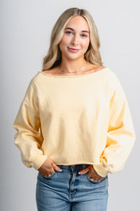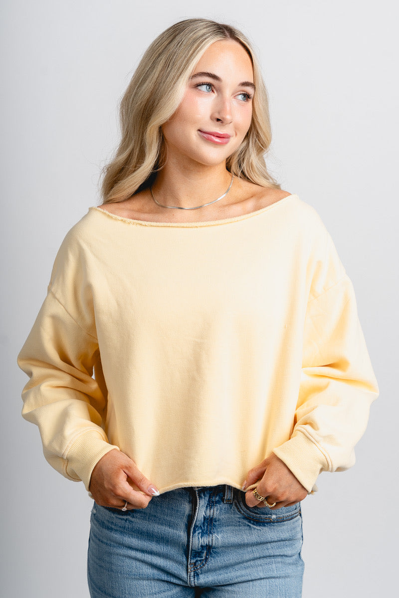 Cropped raw hem off shoulder boxy sweatshirt from Lush Fashion Lounge women's boutique in Oklahoma City.