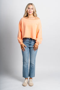 Cropped raw hem off shoulder boxy sweatshirt from Lush Fashion Lounge women's boutique in Oklahoma City.