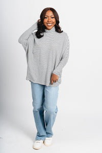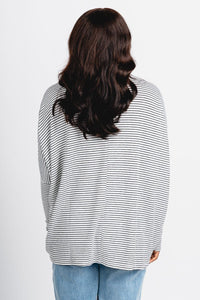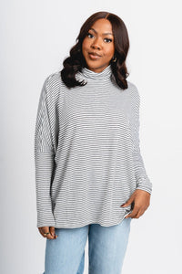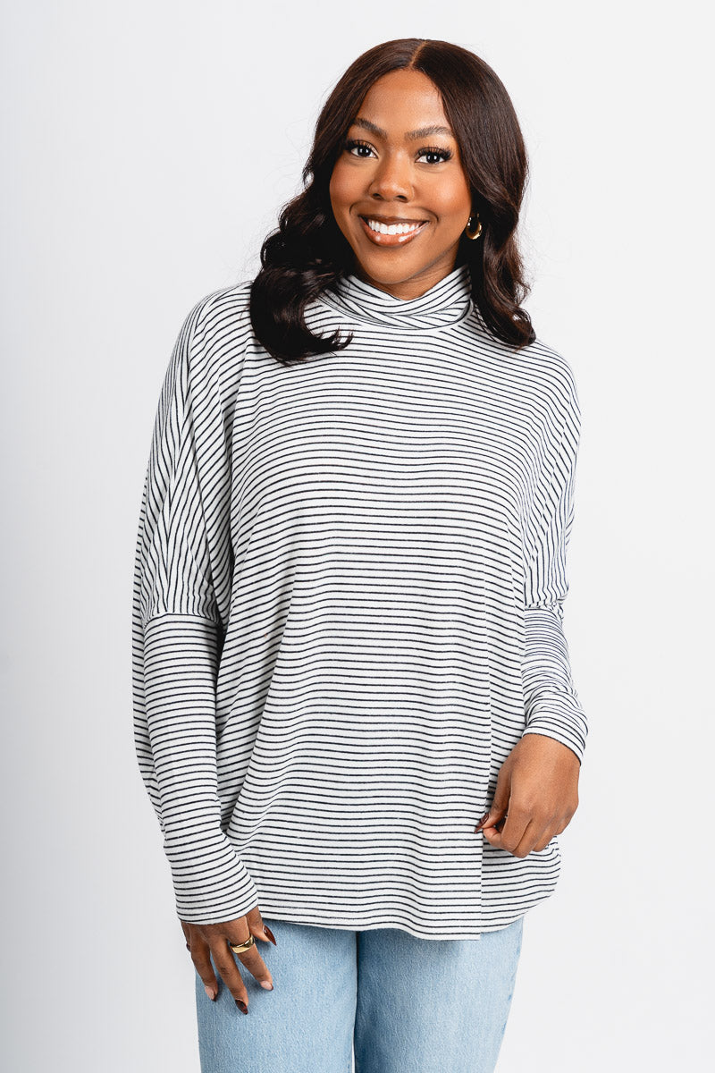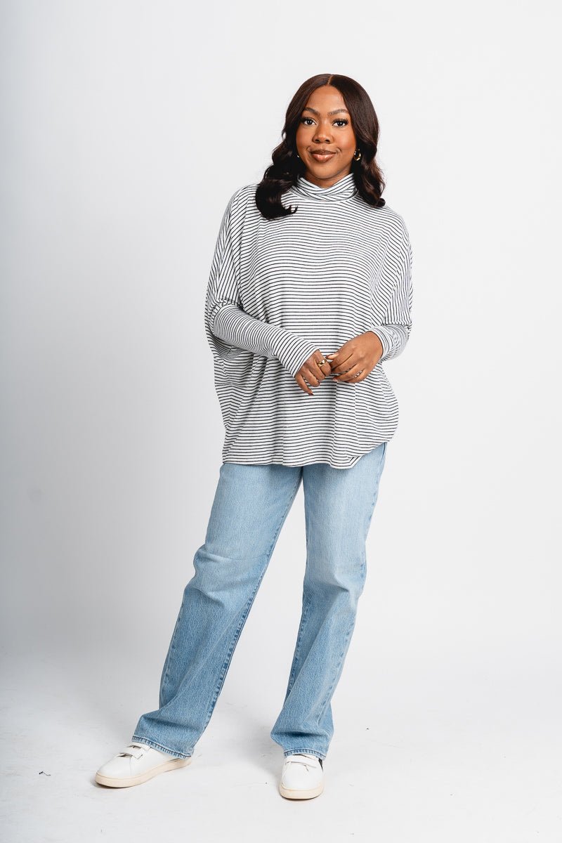 Cream boxy oversized long sleeve top featuring a mock neck and thin black horizontal stripes from Lush Fashion Lounge women's boutique in Oklahoma City.