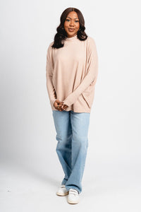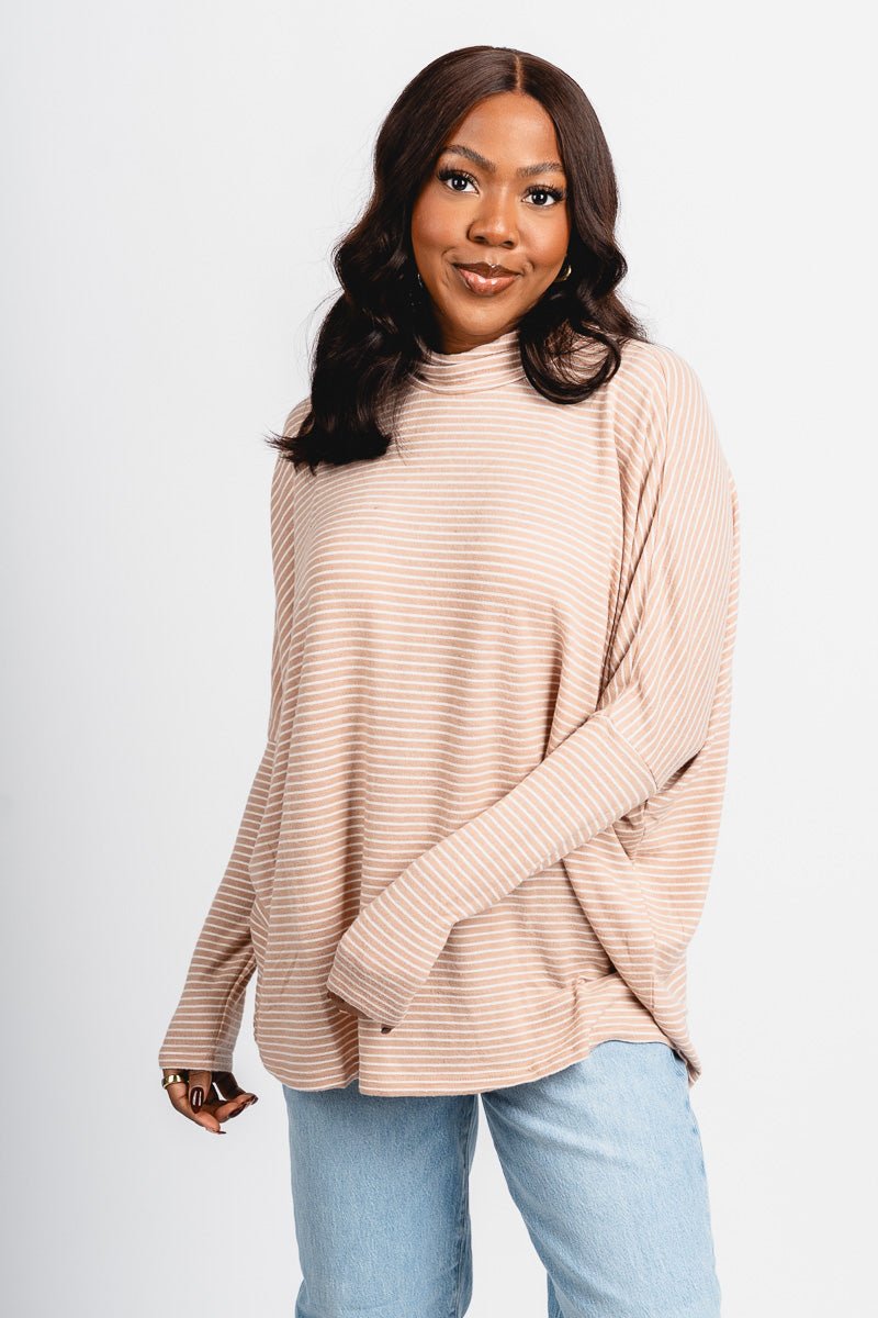 Taupe boxy oversized long sleeve top featuring a mock neck and thin white horizontal stripes from Lush Fashion Lounge women's boutique in Oklahoma City.