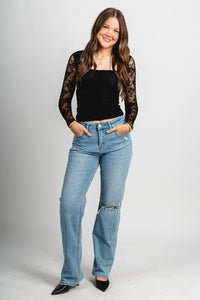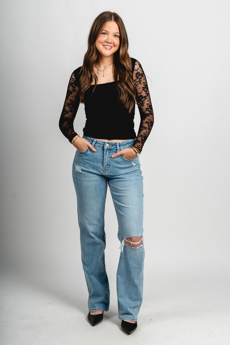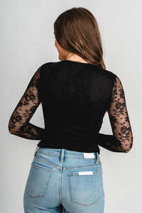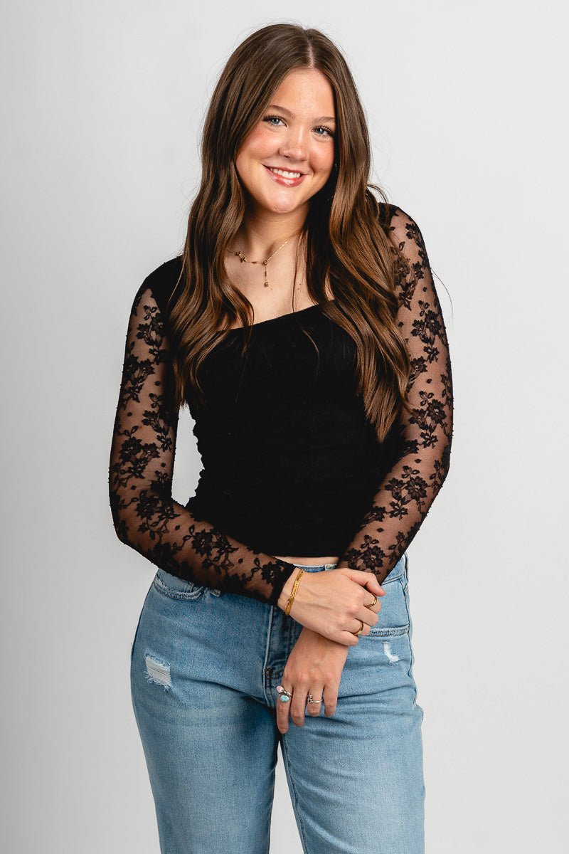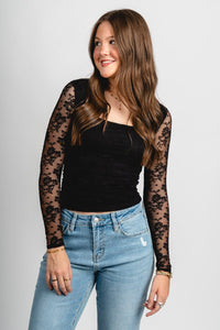 Long sleeve ruched square neck top that is fully lace throughout and lined though the torso from Lush Fashion Lounge women's boutique in Oklahoma City.