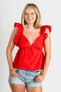 Red ruffle sleeve babydoll top that ties in the back with cinches at the waist from Lush Fashion Lounge women's boutique in Oklahoma City.