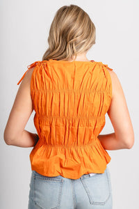 Sleeveless high neck smocked tank top featuring two straps the tie together at the shoulder with a ruffle bottom hem line from Lush Fashion Lounge women's boutique in Oklahoma City.