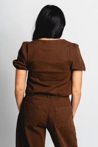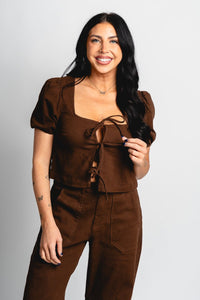 Puff sleeve square neck short sleeve denim top featuring three ties down the front from Lush Fashion Lounge women's boutique in Oklahoma City.