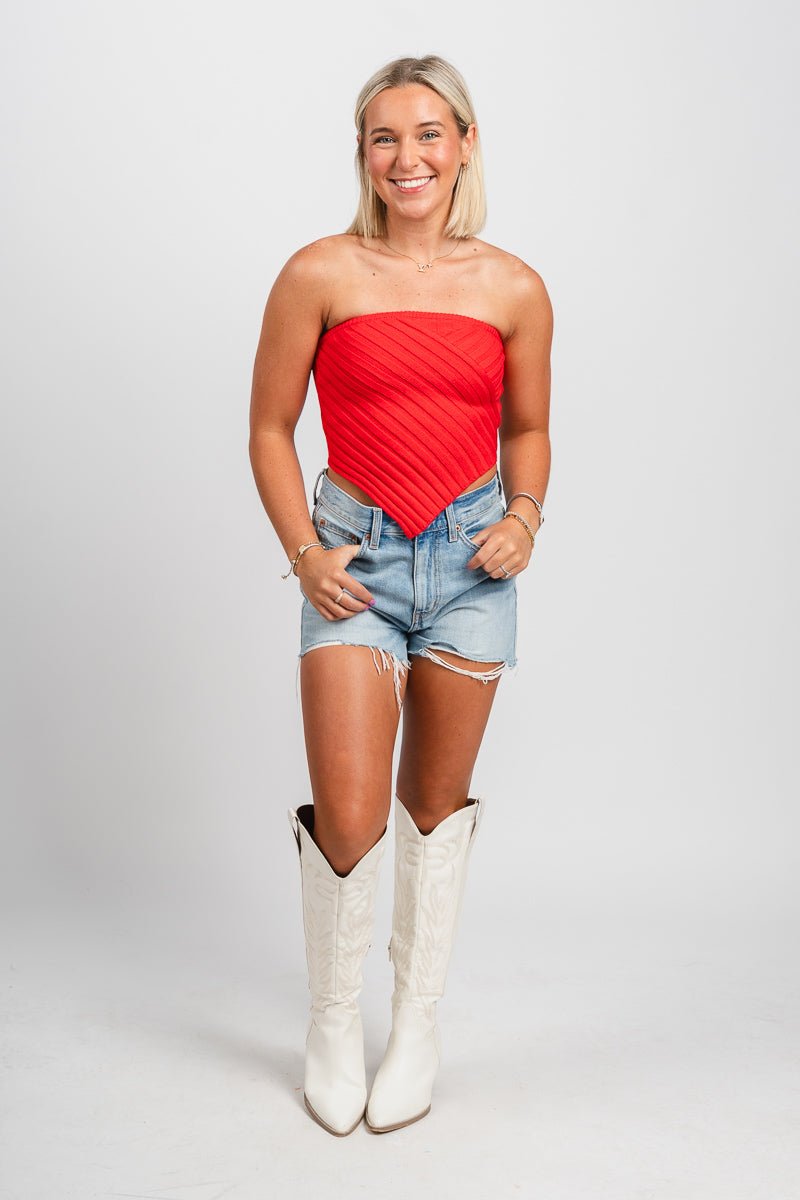 Red strapless sweater scarf cop top that comes to a point at the bottom in the front from Lush Fashion Lounge women's boutique in Oklahoma City.