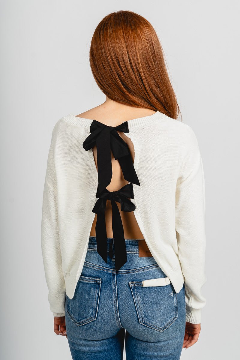 Cream knit sweater featuring an open back with two black bows that tie for closure from Lush Fashion Lounge women's boutique in Oklahoma City.