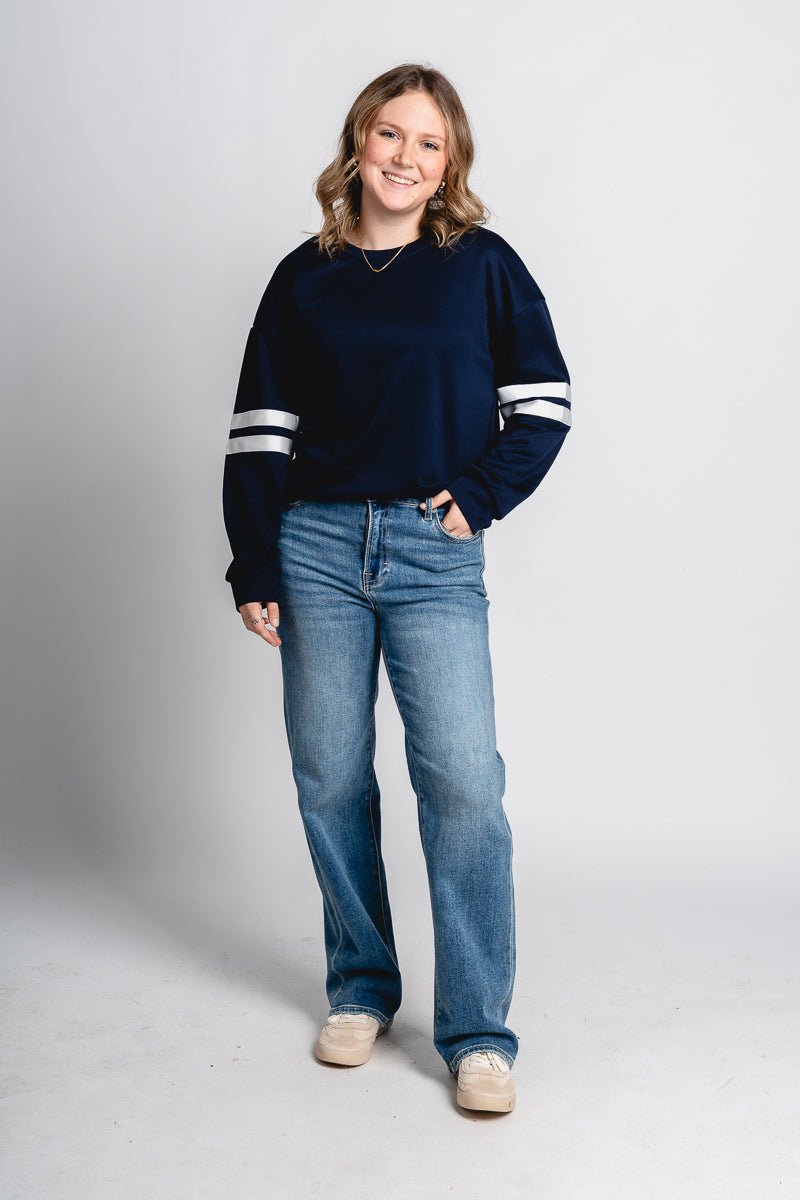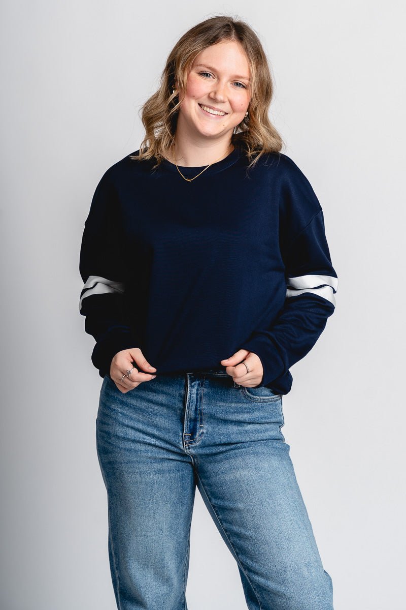 Crew neck navy sweatshirt featuring two white varsity style stripes on each sleeve from Lush Fashion Lounge women's boutique in Oklahoma City.