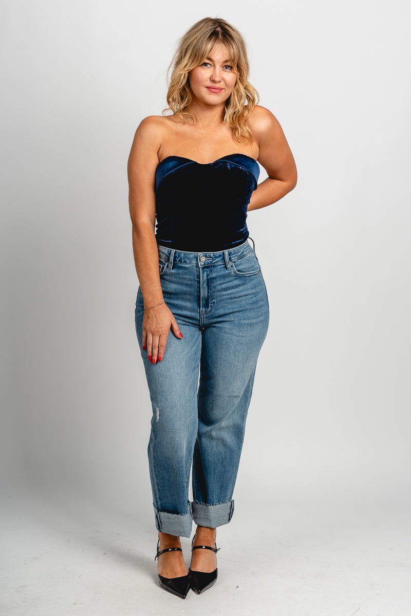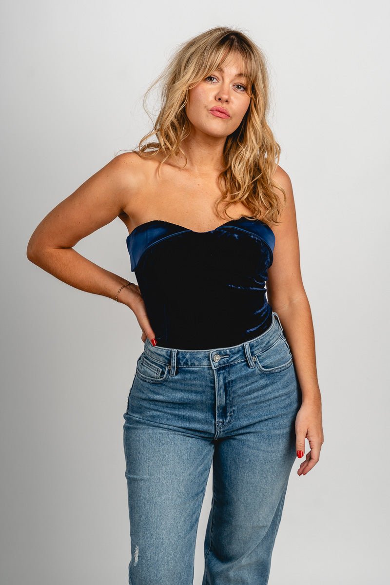 Strapless velvet bustier top featuring two fold over satin bands at the chest from Lush Fashion Lounge women's boutique in Oklahoma City.