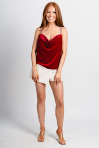 Red velvet cami tank top with rhinestone straps from Lush Fashion Lounge women's boutique in Oklahoma City.
