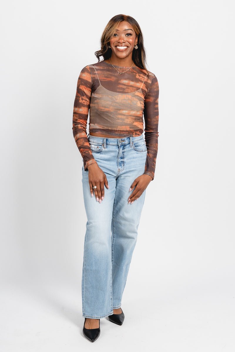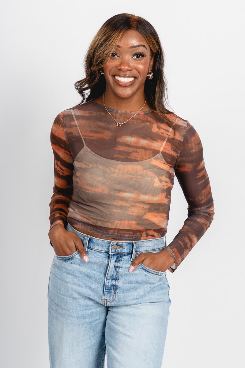 Mesh fitted long sleeve top featuring a water color print made of colors brown, orange, grey, and cream from Lush Fashion Lounge women's boutique in Oklahoma City.