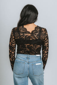 Fully lace long sleeve bodysuit with scalloped v neck line. The chest portion is lined leaving the remainder of the bodysuit unlined from Lush Fashion Lounge women's boutique in Oklahoma City.
