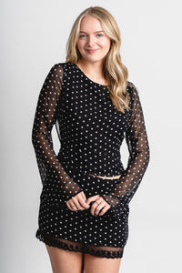 Black and white polka dot top featuring an open back the ties at the back of the waist from Lush Fashion Lounge women's boutique in Oklahoma City.