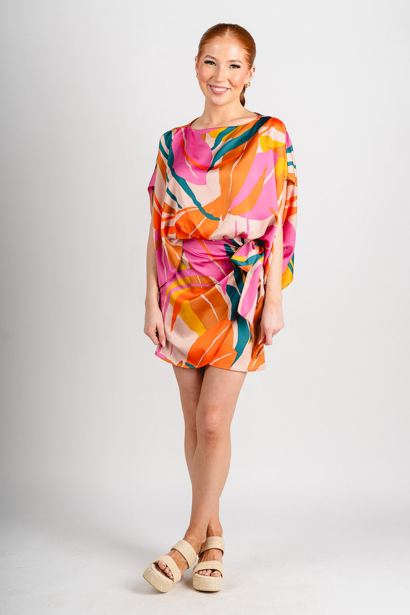 Satin mini dress that wraps and ties around the waist featuring an abstract print with colors fuchsia, light pink, teal, mustard, and orange from Lush Fashion Lounge women's boutique in Oklahoma City.