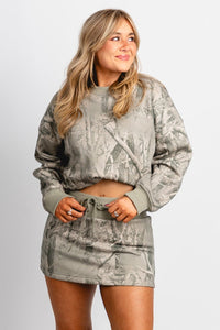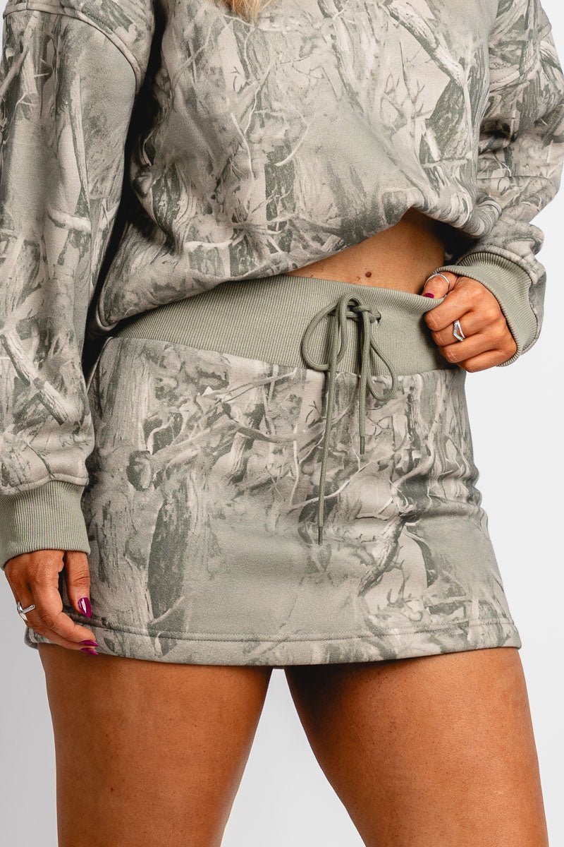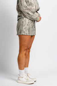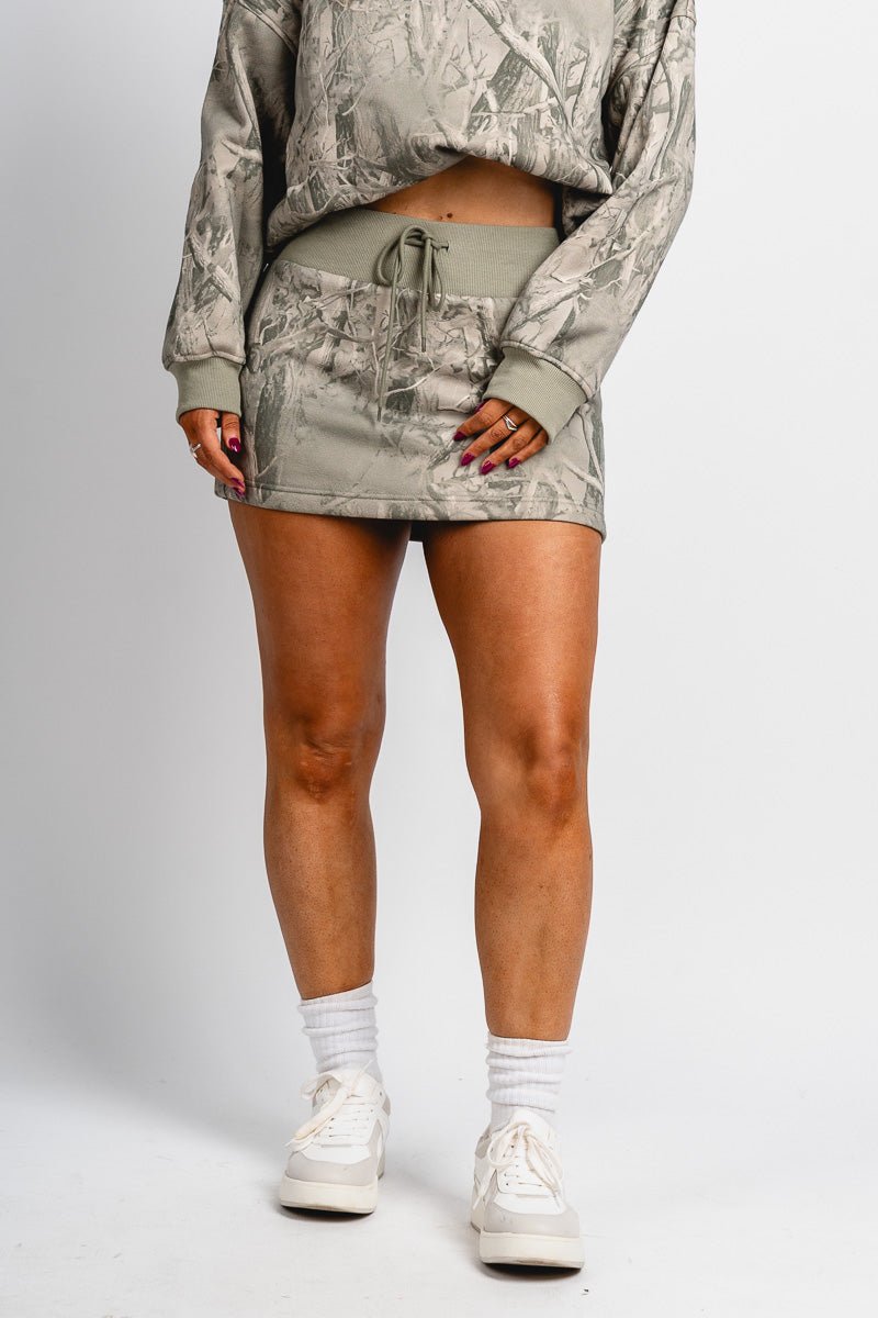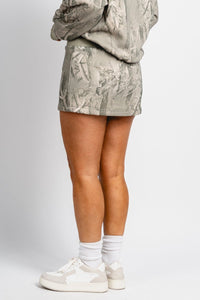 Sage green mini skort featuring an earthy camoflauge print from Lush Fashion Lounge women's boutique in Oklahoma City.