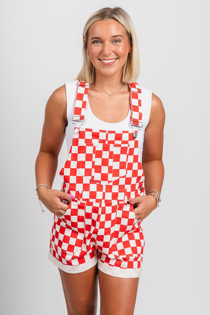 Red and white checkered shorts overalls with a chest pocket, belt loops, hip pockets, and cuffed shorts from Lush Fashion Lounge women's boutique in Oklahoma City.