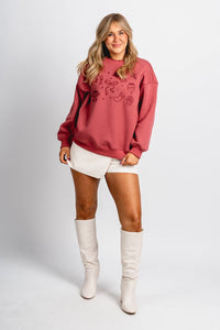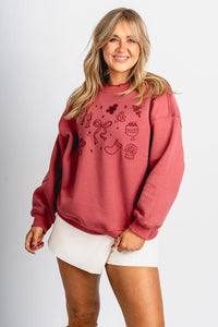 Crew neck sweatshirt featuring tone on tone Christmas style embroidery with gingerbread men, stockings, holly, and more from Lush Fashion Lounge women's boutique in Oklahoma City.
