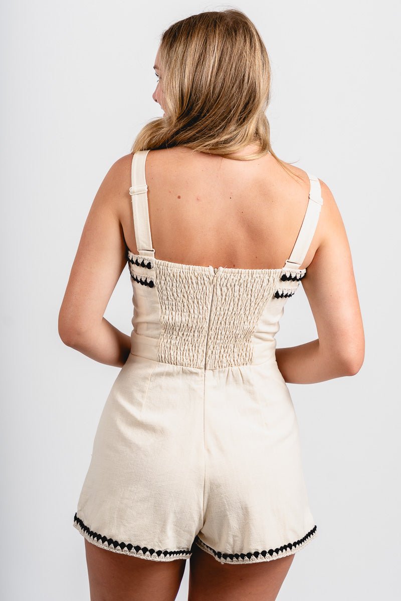 Sleeveless cream romper with black and cream embroidery trim around the neck line, pockets, and legs from Lush Fashion Lounge women's boutique in Oklahoma City.