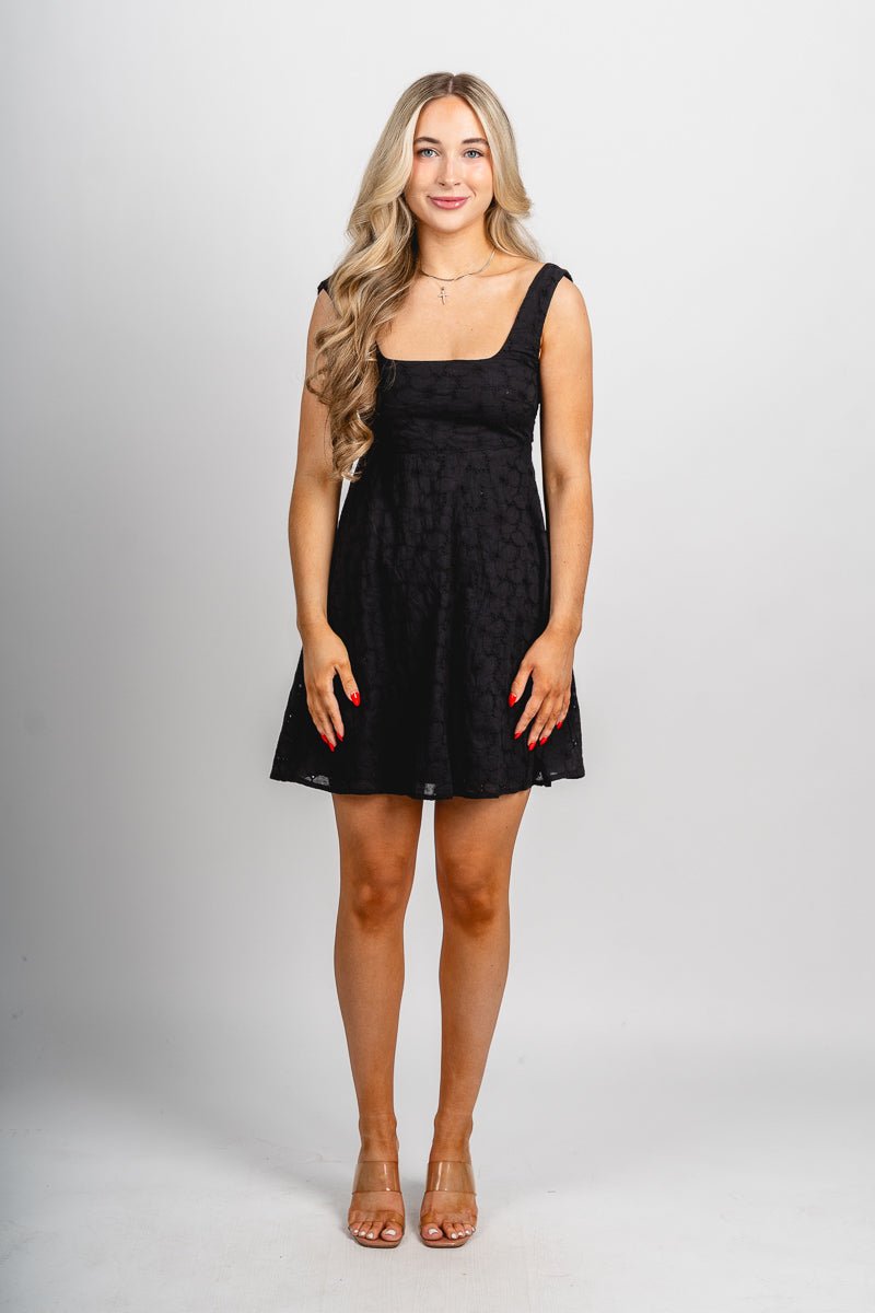 Eyelet lace sleeveless mini dress featuring a flared skirt from Lush Fashion Lounge women's boutique in Oklahoma City.