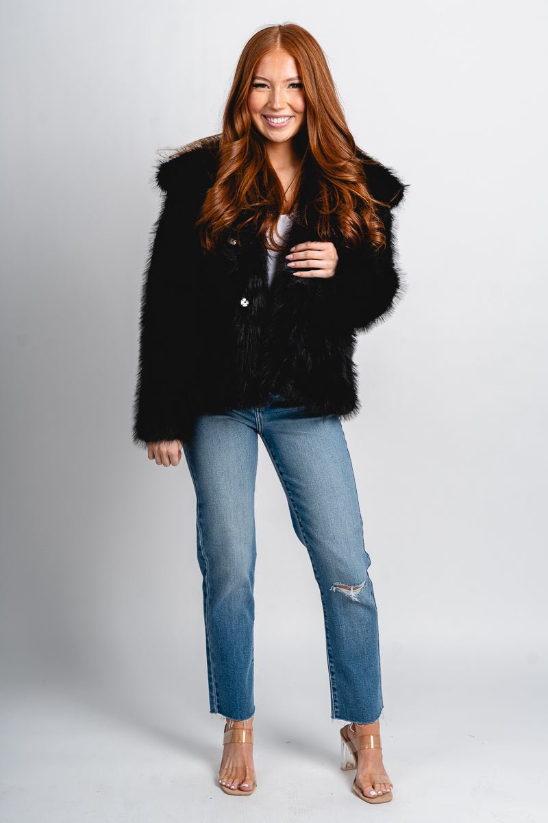 Collared faux fur jacket with a button closure at the waist from Lush Fashion Lounge women's boutique in Oklahoma City.
