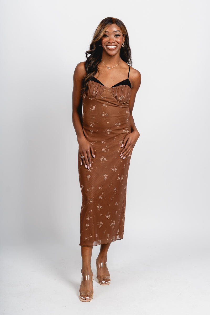 Sleeveless brown mesh fitted midi dress featuring a cream flower print and black adjustable spaghetti straps from Lush Fashion Lounge women's boutique in Oklahoma City.