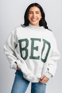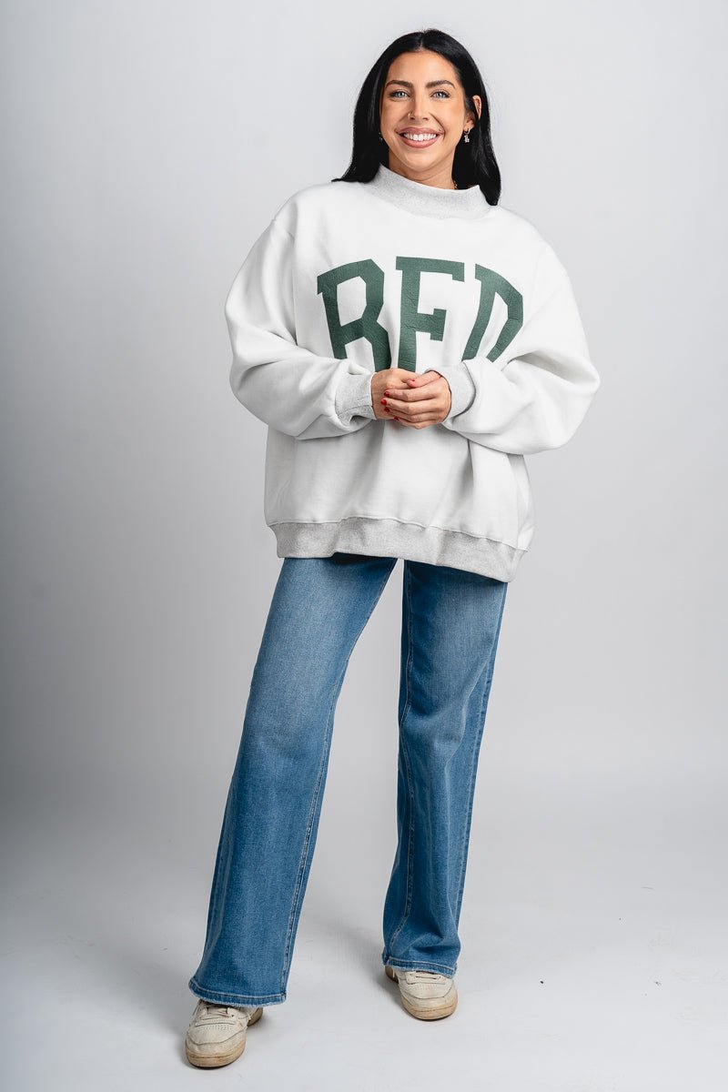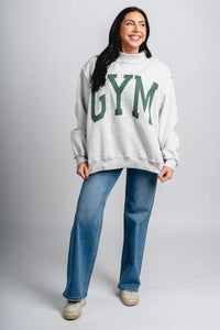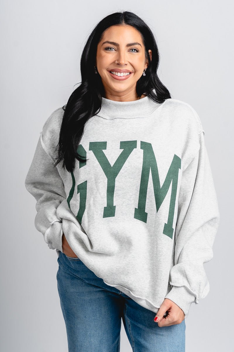 Heather grey REVERSIBLE oversized mock neck sweatshirt featuring "GYM" across the chest in a green block font and "BED" in a green block font on the reverse side from Lush Fashion Lounge women's boutique in Oklahoma City.