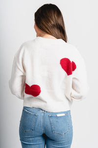 Cream crew neck sweater featuring large dark magenta hearts throughout from Lush Fashion Lounge women's boutique in Oklahoma City.