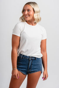 High waist micro denim shorts with one inch inseam from Lush Fashion Lounge women's boutique in Oklahoma City.