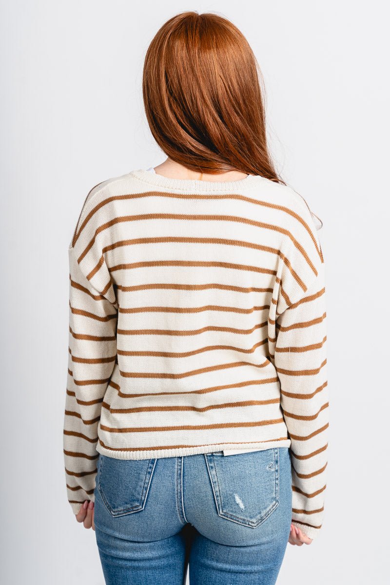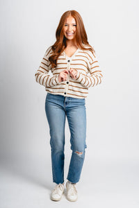 Cream colored lightweight knit button up cardigan featuring thin horizontal camel stripes from Lush Fashion Lounge women's boutique in Oklahoma City.