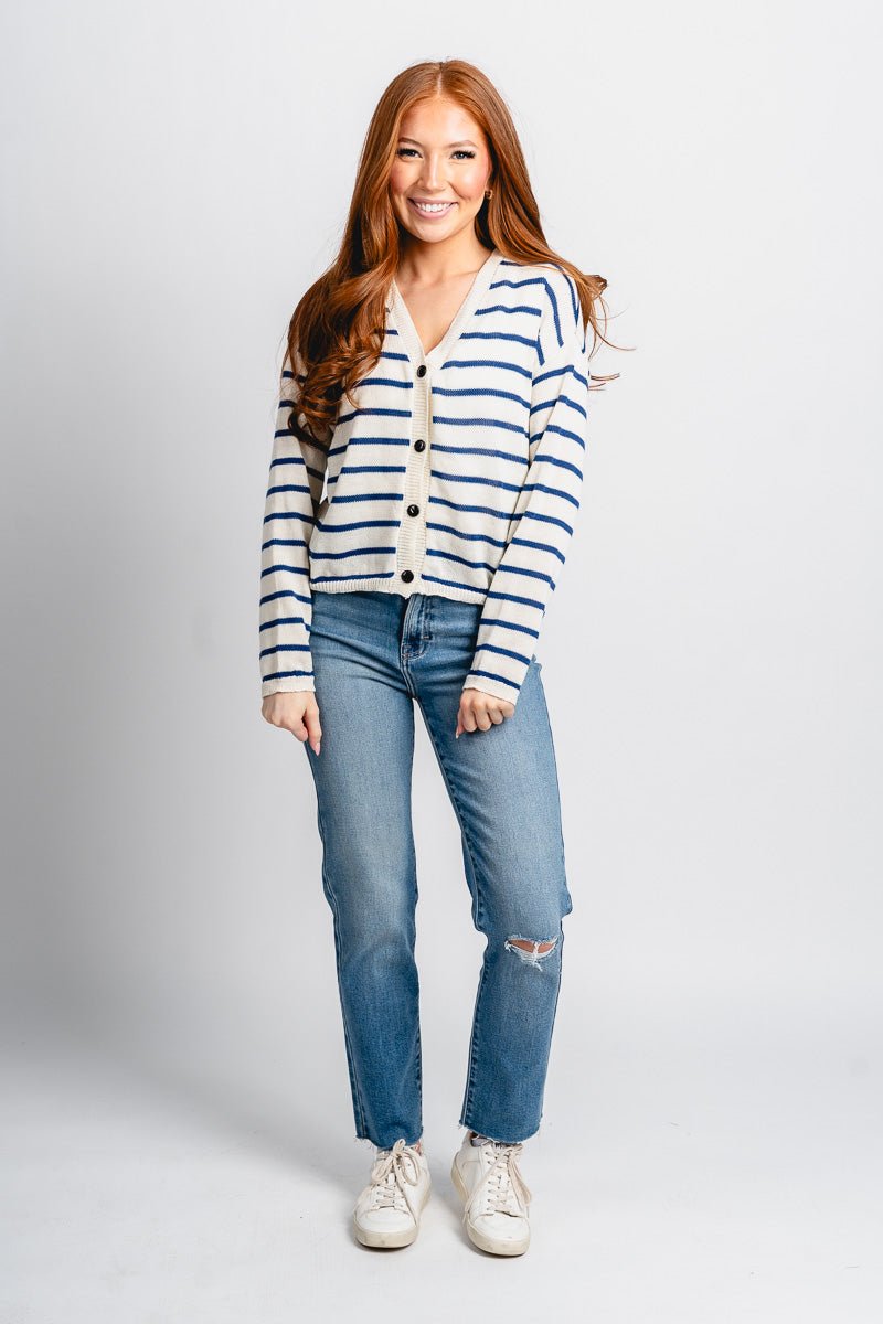 Cream colored lightweight knit button up cardigan featuring thin horizontal black stripes from Lush Fashion Lounge women's boutique in Oklahoma City.