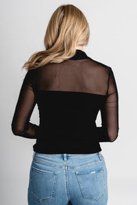 Long sleeve high neck mesh top with a solid layer from the top of the chest to the bottom of the shirt from Lush Fashion Lounge women's boutique in Oklahoma City.