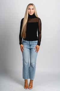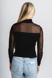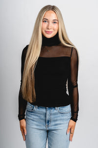 Long sleeve mock neck mesh top featuring ruching on each side. This top is lined from the chest down and sheer on the chest and arms from Lush Fashion Lounge women's boutique in Oklahoma City.