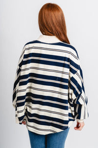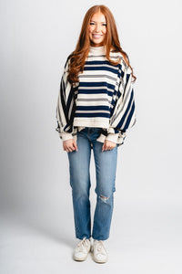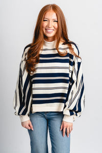 Cream mock neck oversized sweatshirt featuring thick horizontal navy stripes and thin taupe horizontal stripes from Lush Fashion Lounge women's boutique in Oklahoma City.