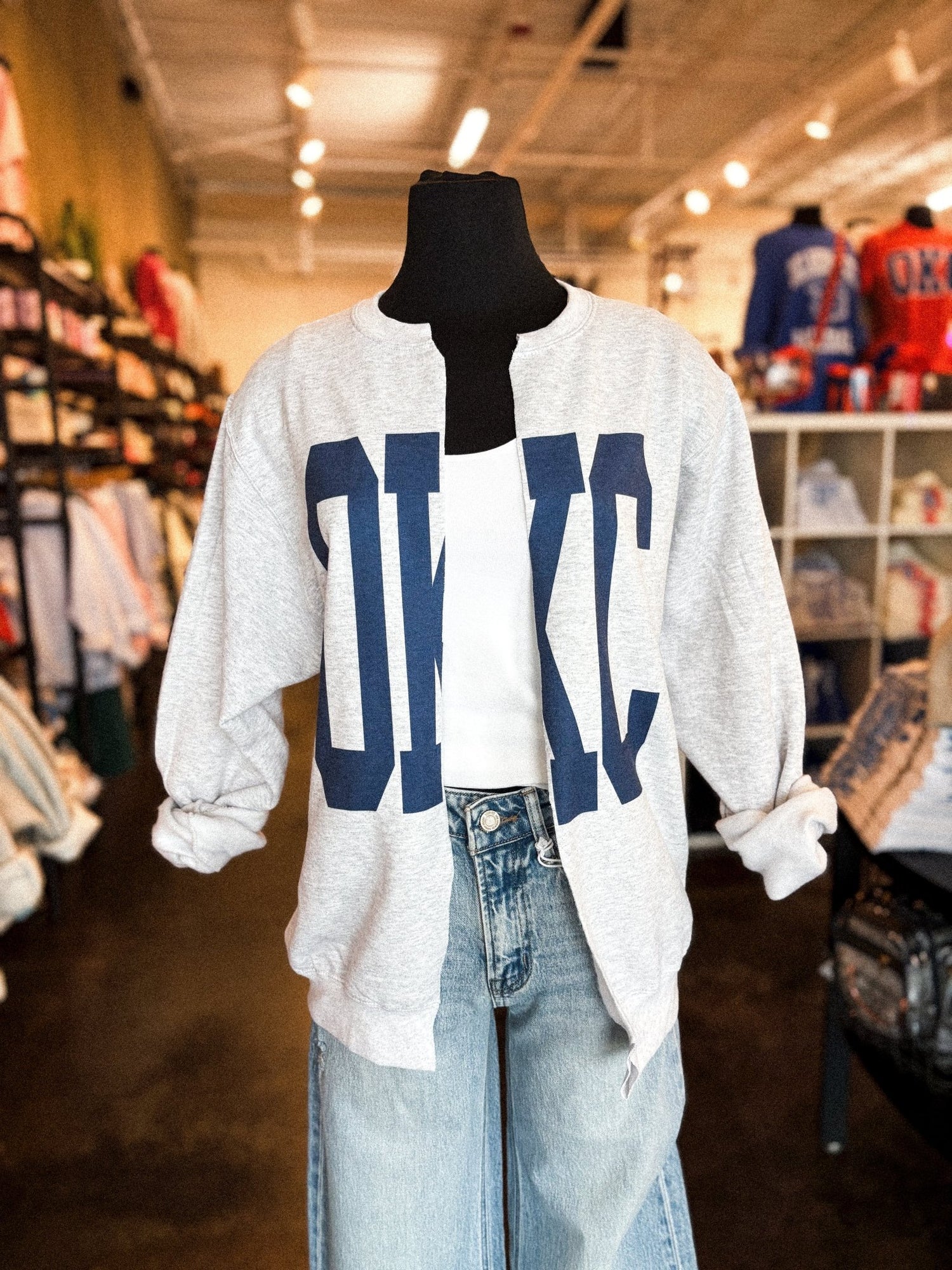 Crew neck sweatshirt cut up the middle like a cardigan featuring "OKC" in a large navy varsity block font from Lush Fashion Lounge women's boutique in Oklahoma City.
