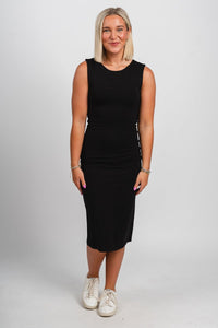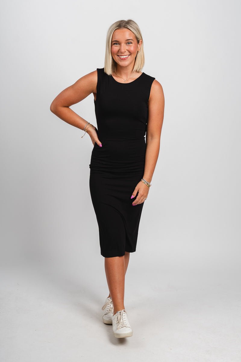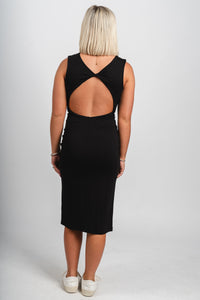 Fitted sleeveless black midi dress with large cut out on the back from Lush Fashion Lounge women's boutique in Oklahoma City.