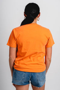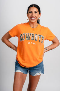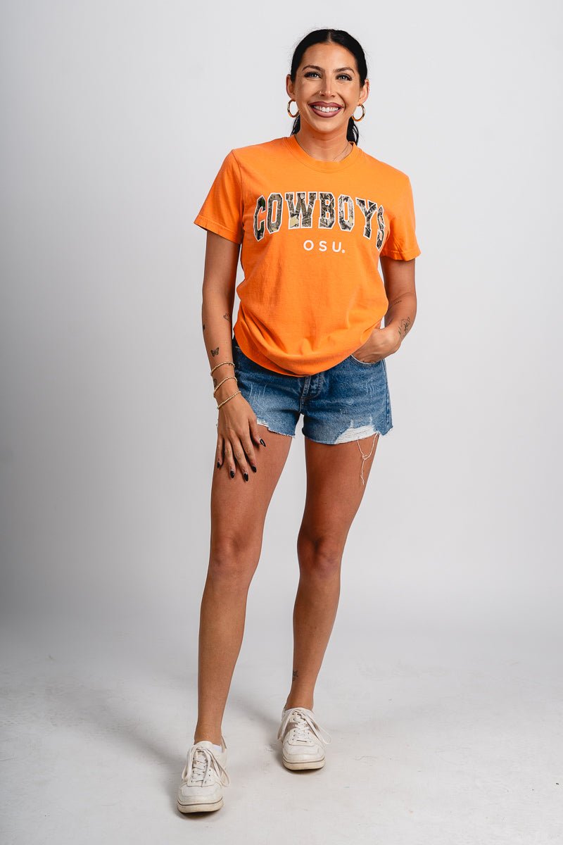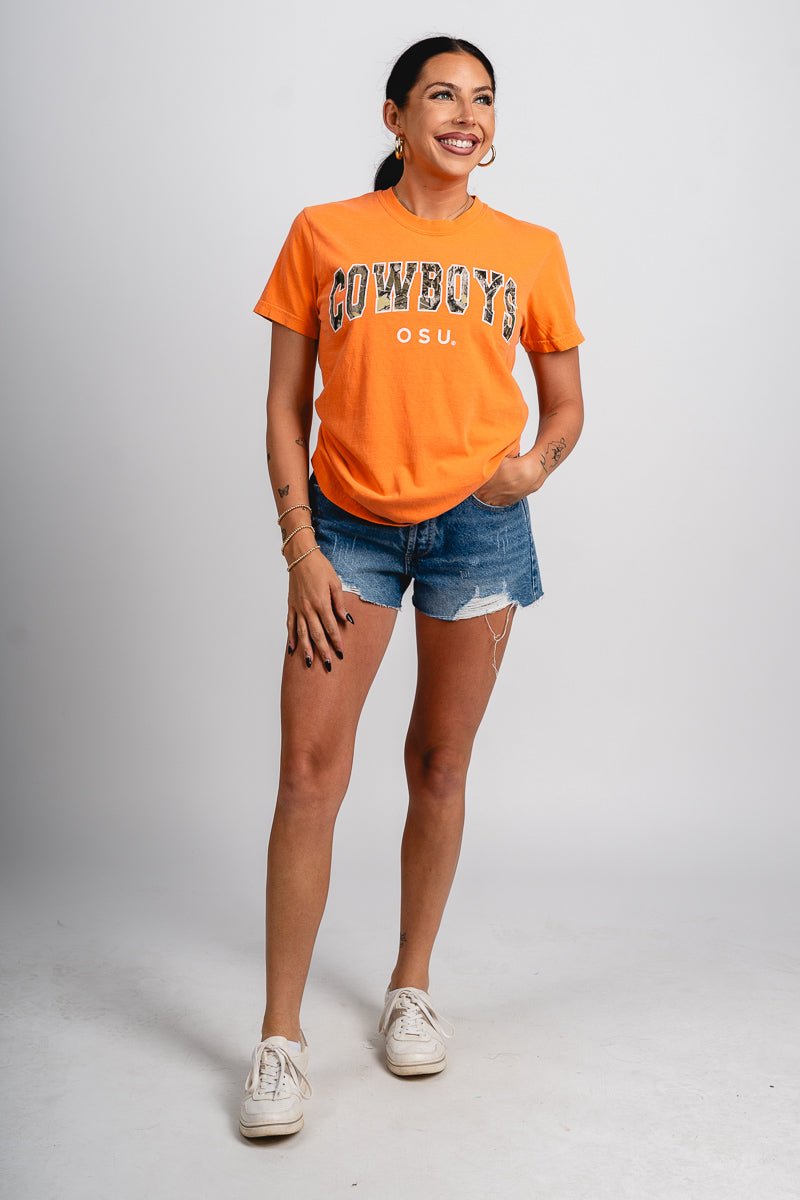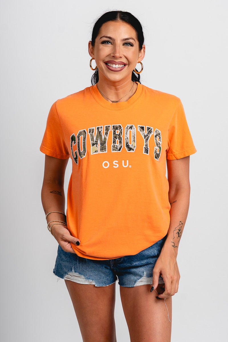 Orange short sleeve t-shirt with block letters spelling "Cowboys" and each letter is filled with a camouflage print. A small "OSU' is underneath "Cowboys" from Lush Fashion Lounge women's boutique in Oklahoma City.