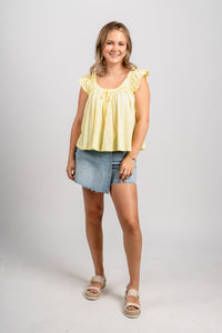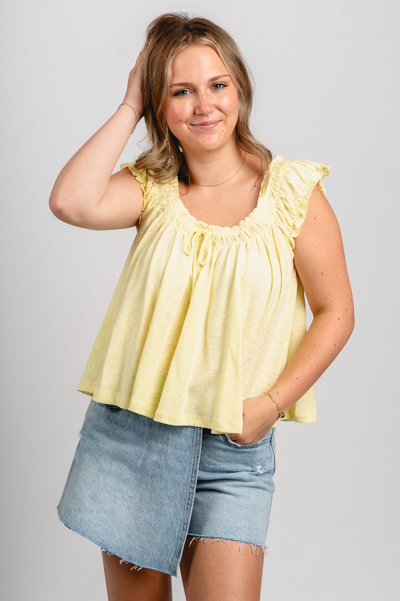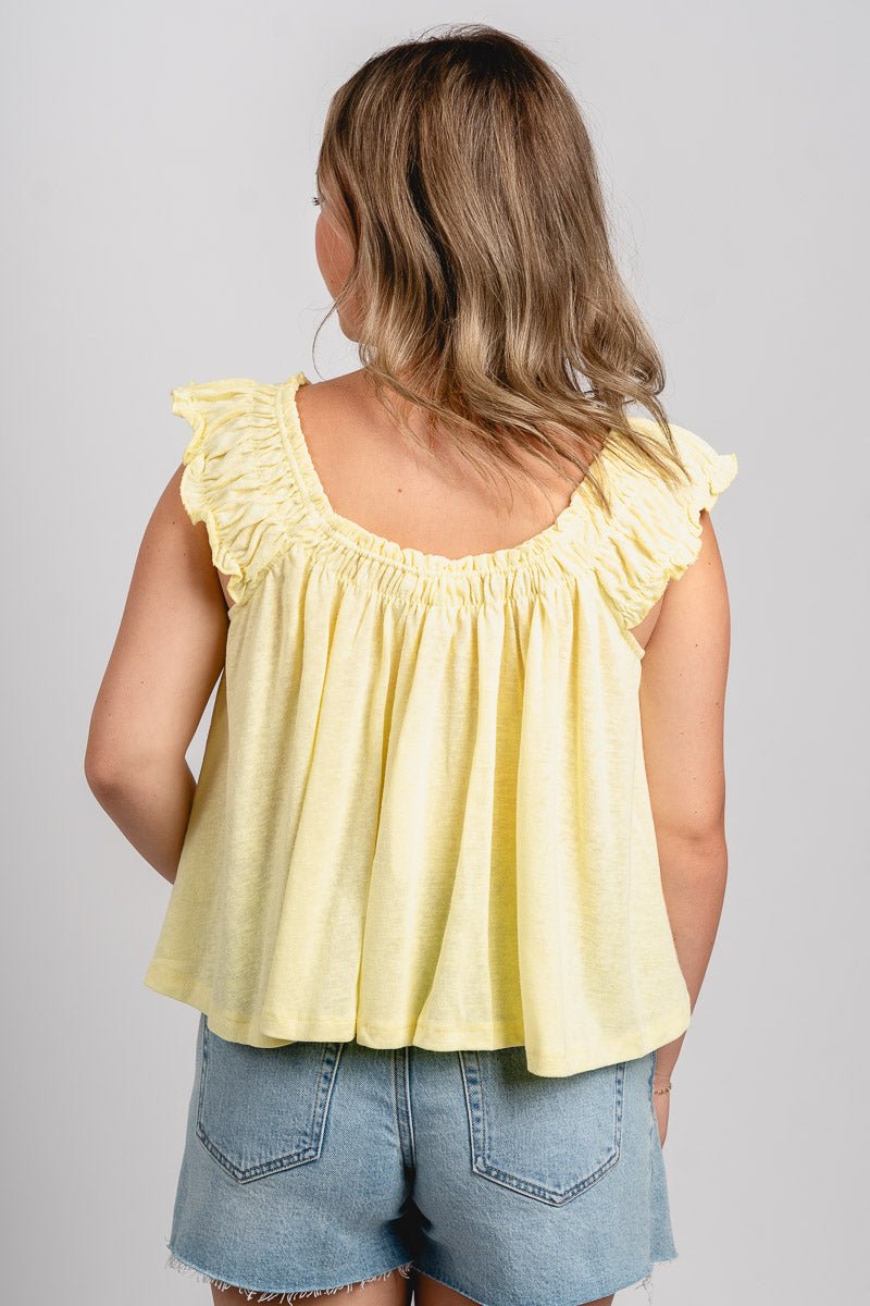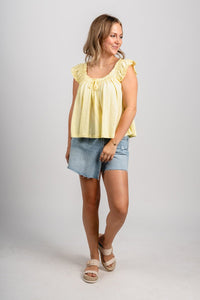 Flowy cotton tank top with ruffle straps and a small tie at the top of the chest from Lush Fashion Lounge women's boutique in Oklahoma City.