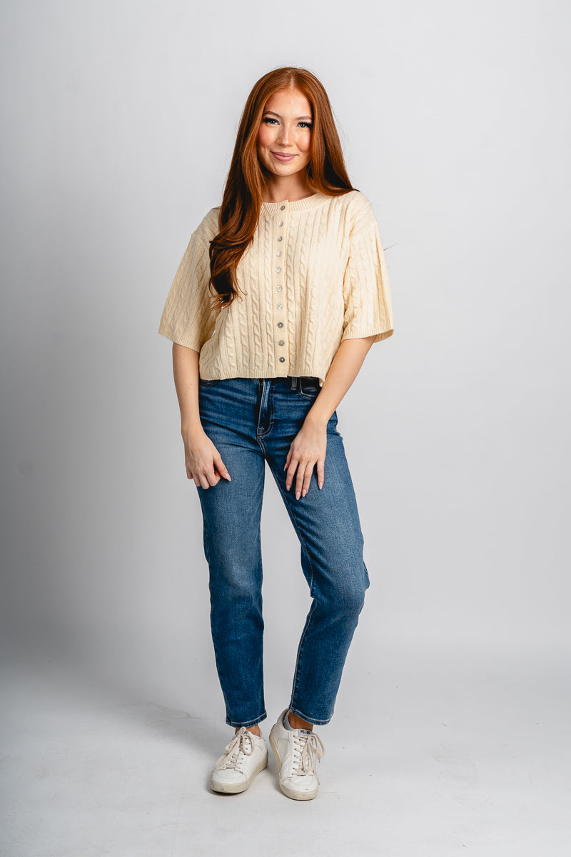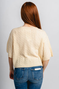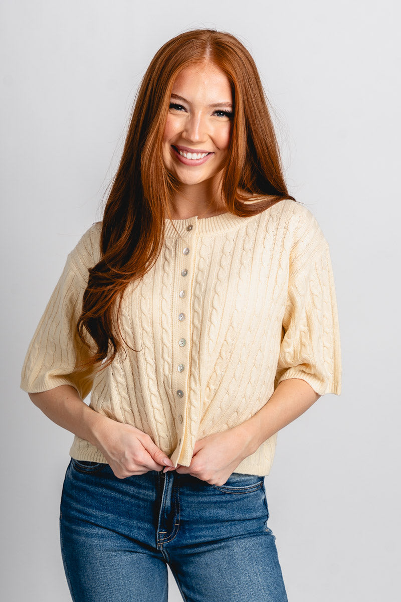 Short sleeve lightweight cable knit sweater cardigan from Lush Fashion Lounge women's boutique in Oklahoma City.