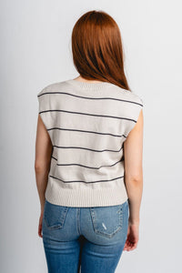 Grey sleeveless button up sweater vest featuring black horizontal stripes from Lush Fashion Lounge women's boutique in Oklahoma City.