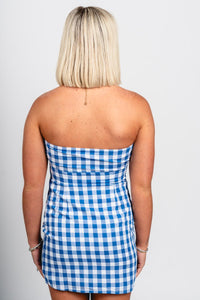 Blue checkered strapless dress from Lush Fashion Lounge women's boutique in Oklahoma City.