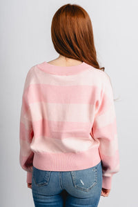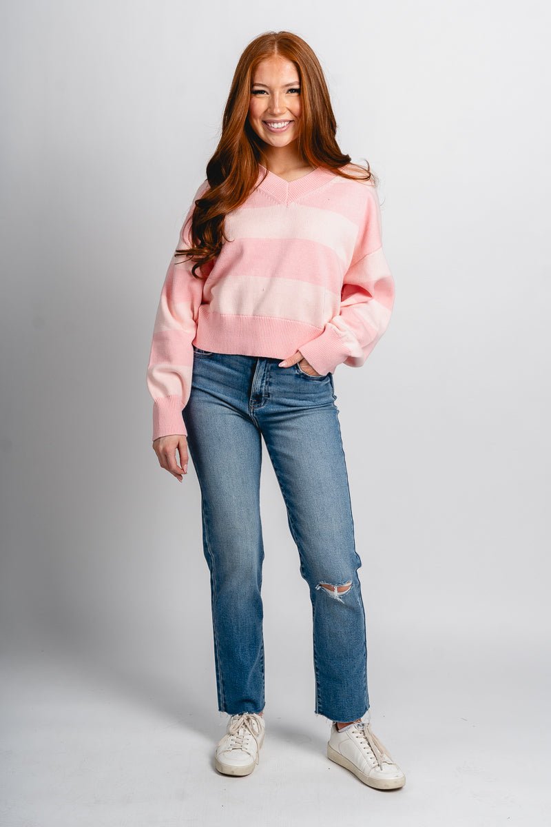 Light pink v-neck crop sweater featuring slightly darker pink horizontal stripes from Lush Fashion Lounge women's boutique in Oklahoma City.