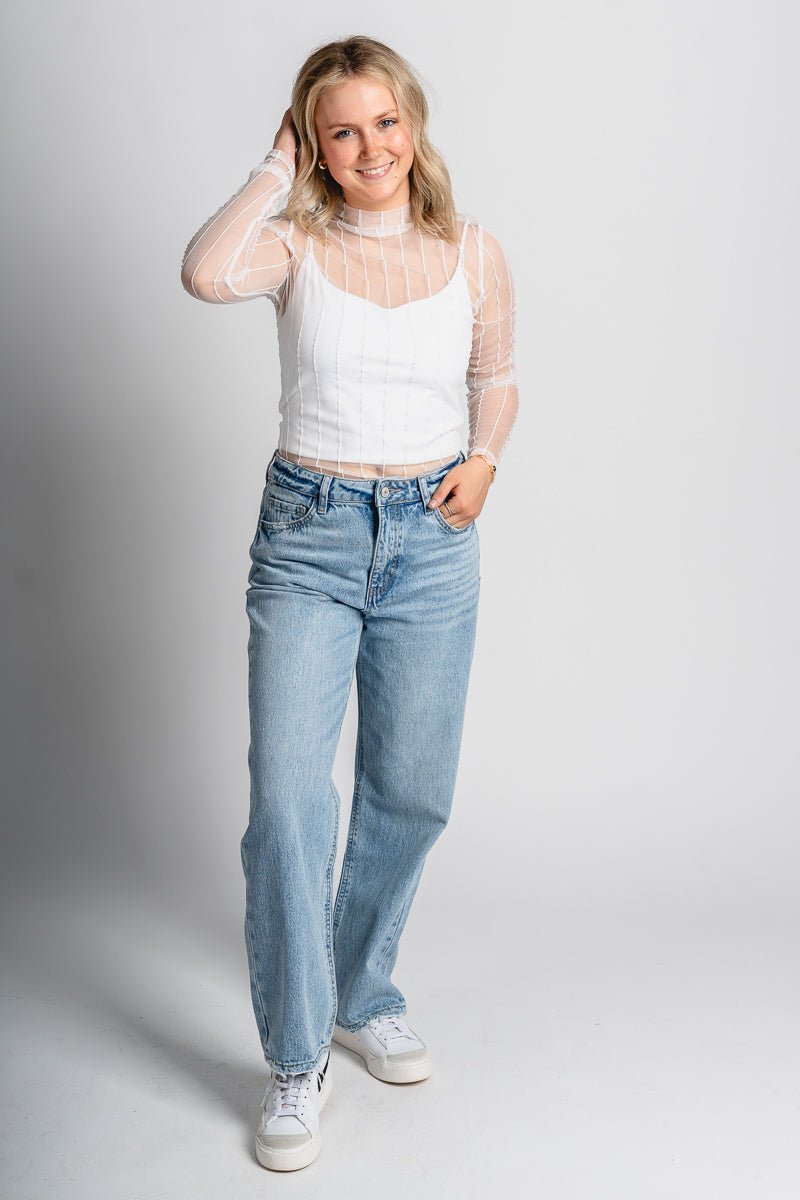 Lush boutique in OKC has a variety of cute bodysuits and more! This trendy mesh bodysuit is perfect for any occasion! A must have! This bodysuit comes with a built in bandeau.