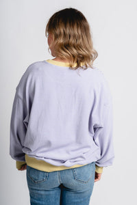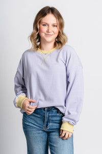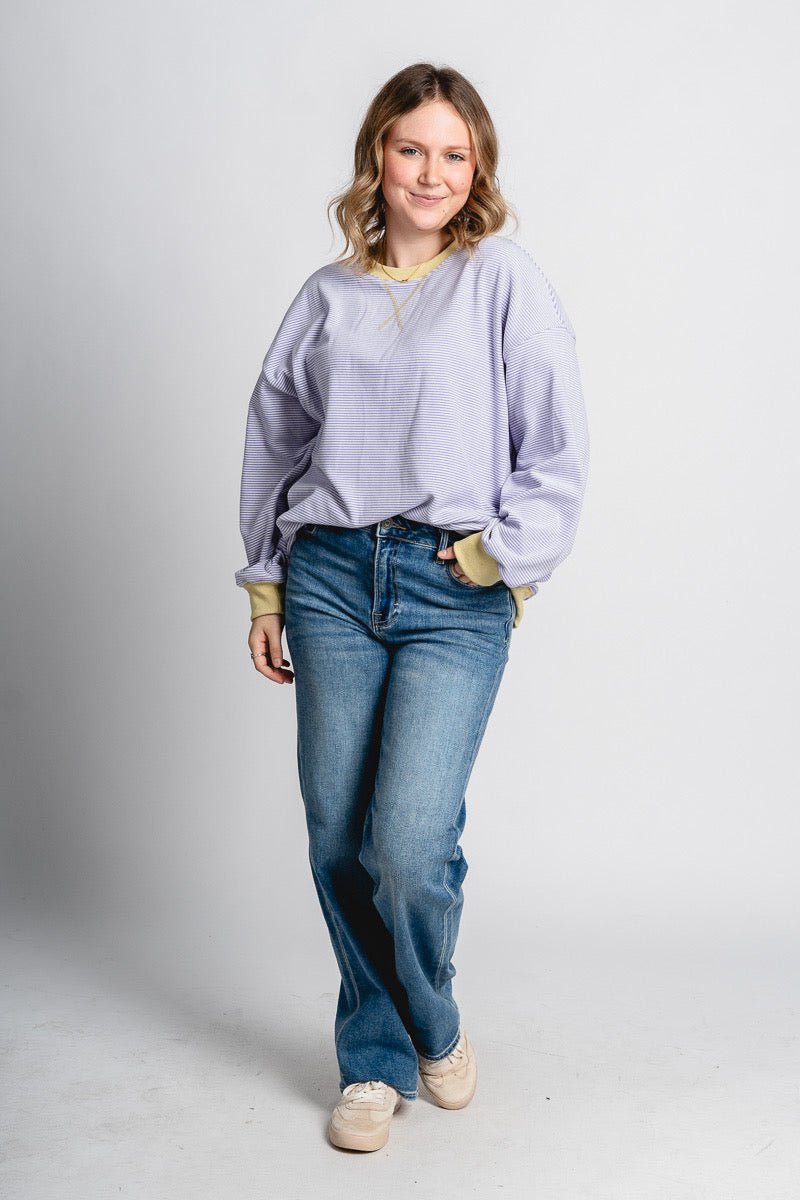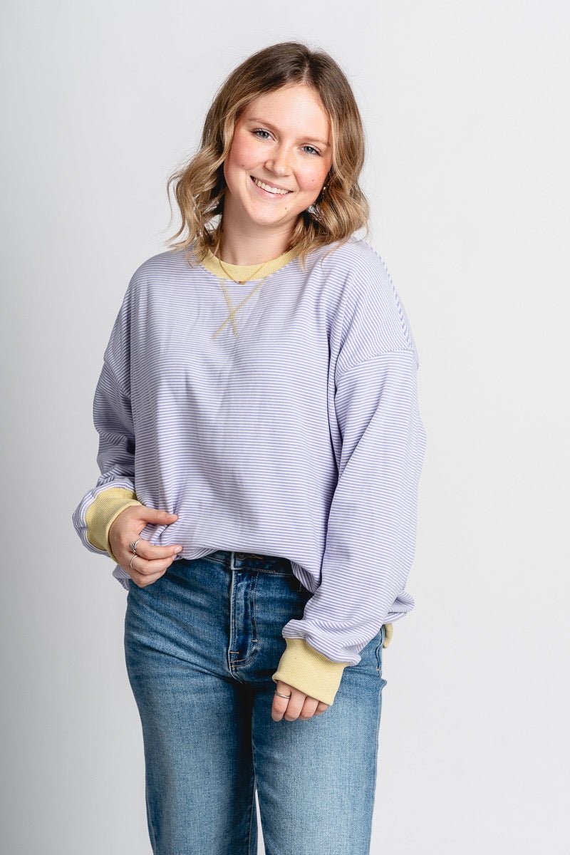 Oversized sweatshirt featuring thin white and lavender horizontal stripes and a green trim around the neck and wrists from Lush Fashion Lounge women's boutique in Oklahoma City.