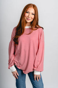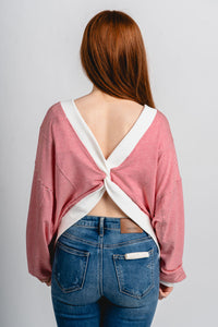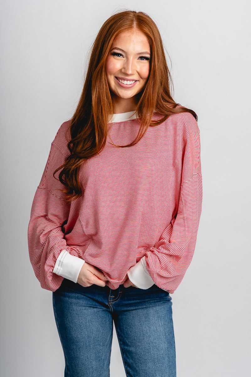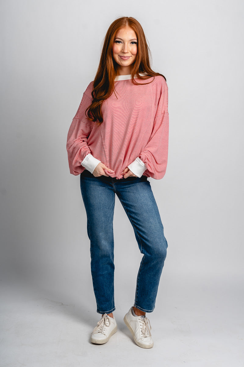 Long sleeve knit top featuring thin red and white horizontal stripes throughout and a twisted open back from Lush Fashion Lounge women's boutique in Oklahoma City.