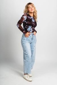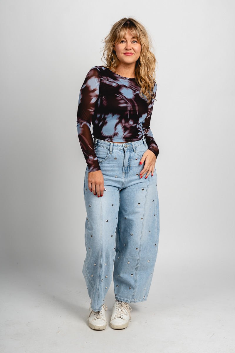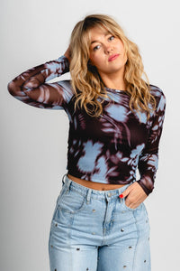 Fitted long sleeve mesh top with a floral-like pattern featuring blue and brown color mix from Lush Fashion Lounge women's boutique in Oklahoma City.