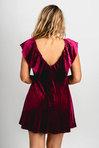 Burgundy v-neck cap sleeve velvet mini dress featuring a black velvet bow at the v of the chest from Lush Fashion Lounge women's boutique in Oklahoma City.