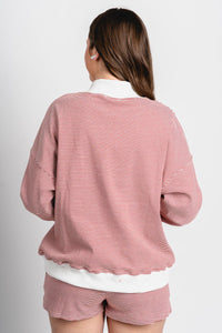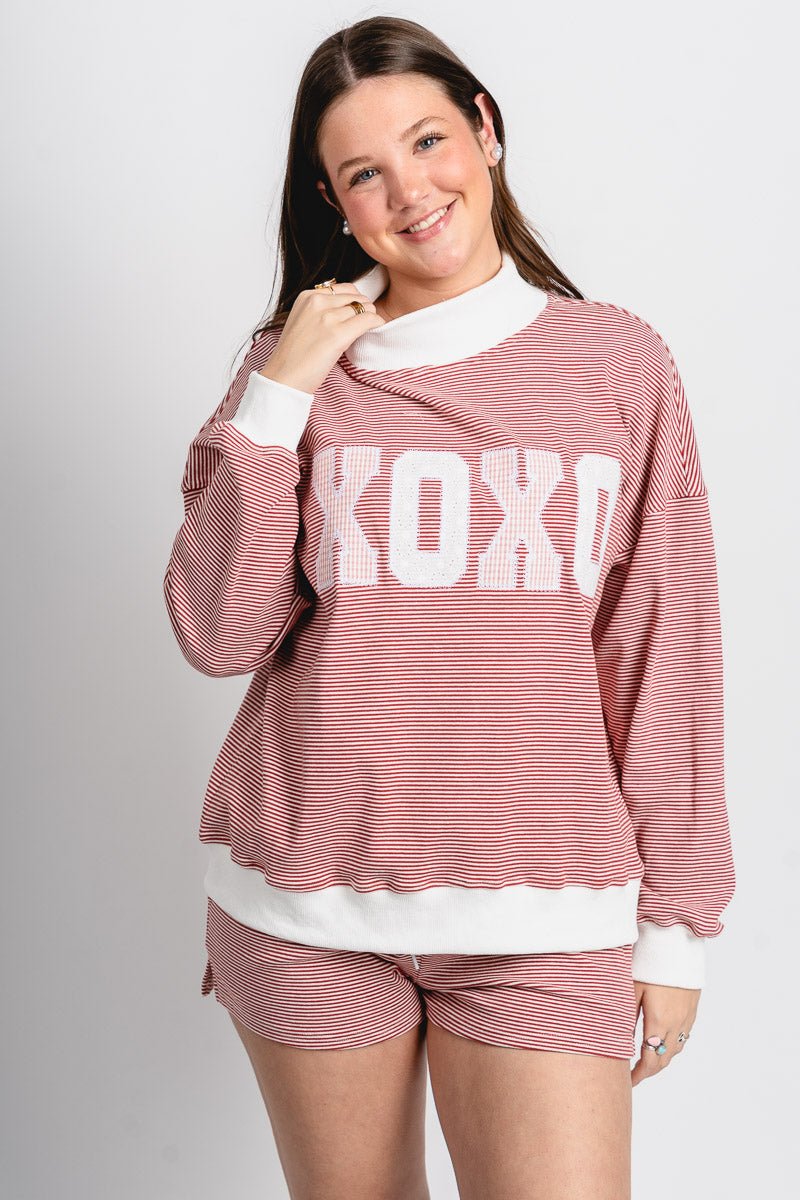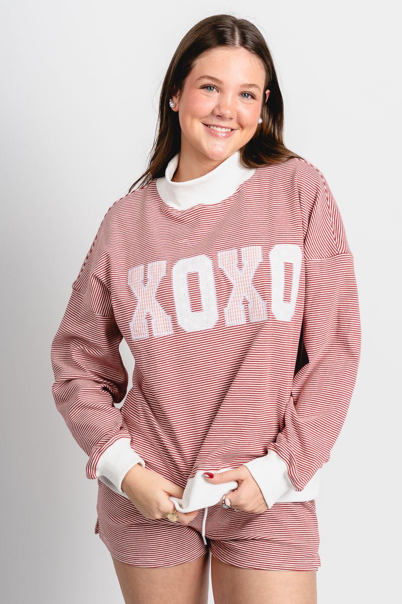 Red and cream striped crew neck sweatshirt featuring "XOXO" in pink and white checkered letter patches from Lush Fashion Lounge women's boutique in Oklahoma City.