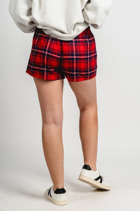 Red, navy, and white plaid boxer shorts from Lush Fashion Lounge women's boutique in Oklahoma City.