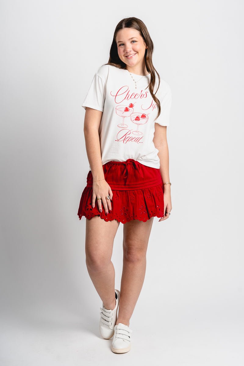 Short sleeve crew neck t-shirt featuring "Cheers Sip Repeat" in red cursive and two martini glasses with heart shaped olives on a toothpick from Lush Fashion Lounge women's boutique in Oklahoma City.