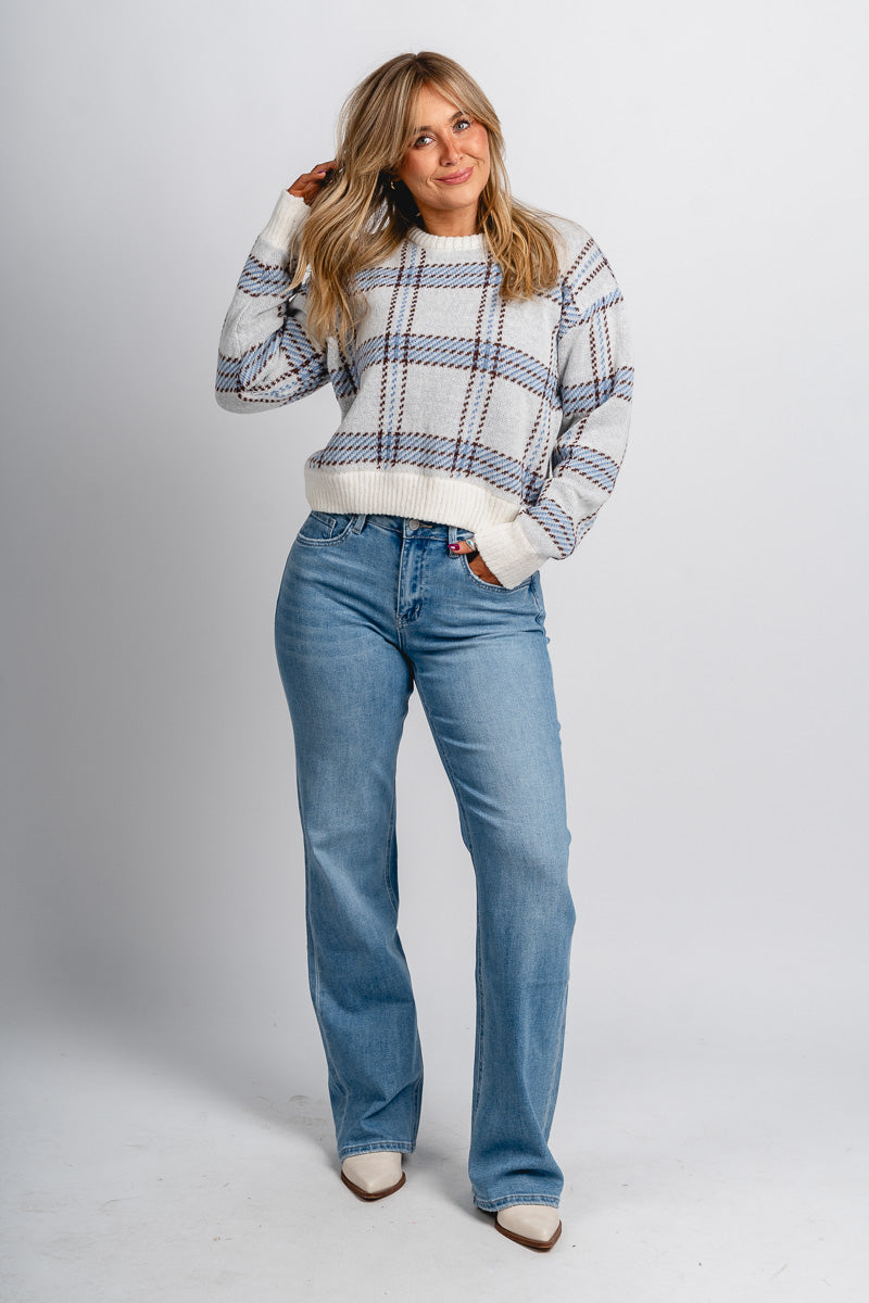 Cream crew neck sweater featuring a large light blue and brown plaid pattern from Lush Fashion Lounge women's boutique in Oklahoma City.